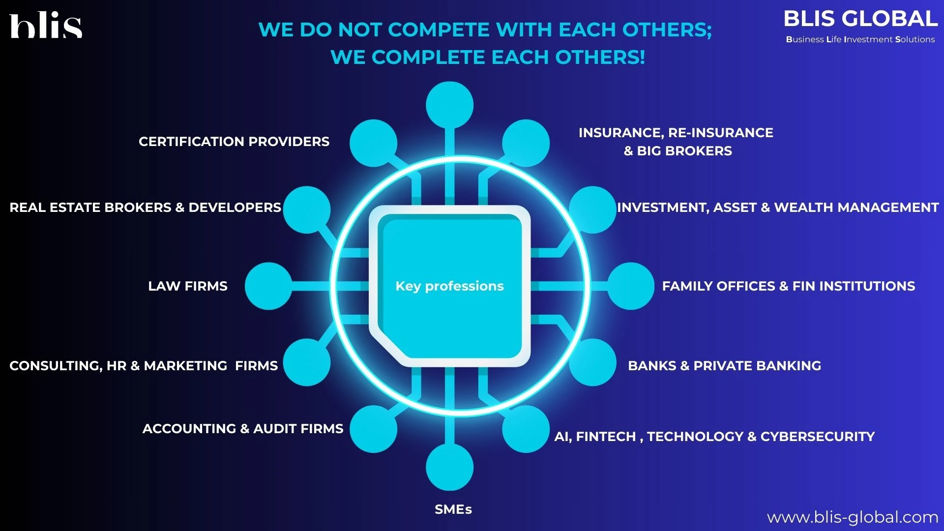 We are building a unique ecosystem for financial and business planning awareness for the public and also to strengthen the strategic collaboration between 10 professions in the field. We beleive that it is the very right time to solve the chaos and lack of trust that people have when it comes to financial and business literacy, and we want to play a major role in closing part of the gap. 50% of SMEs are struggling, 70% of wealth is lost from one generation to another, and very few people are financially happy. Thus, BLIS Global's goal is to align strategic sponsors to support our mission and solve a fairly good share of the problems.